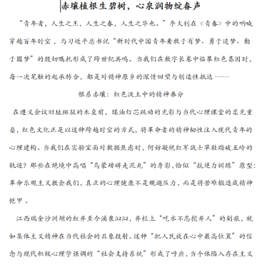 为弘扬艰苦卓绝、无私奉献的苏区精神,做好新时代学生心理健康工作,我们举办了“红心向党,心灵逐光”心理与红色文化融合征文大赛。在新时代背景下,将心理健康教育与红色文化传承紧密结合具有重要意义。红色文化蕴含着丰富的精神力量,对当代人的心理成长和价值观塑造有着积极影响。通过征文活动,引导参与者深入思考红色文化与心理健康的内在联系,促进心理的健康发展和红色基因的传承。鼓励参与者挖掘红色文化中的心理调适、精神激励元素,提升自身心理健康素养。传承红色基因,增强民族自豪感和文化自信,激发爱国爱党情怀。为参与者提供表达自我、分享感悟的平台,促进思想交流。