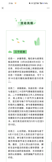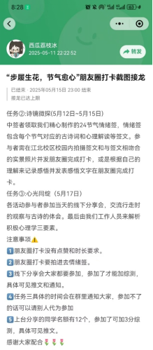 与此同时,任务三通过集体分享与心理解析,深化了活动的育人功能。工作人员在总结中系统梳理了任务中蕴含的积极心理学原理,如“步数目标达成的自我效能感”“古诗意象引发的认知重构”“自然接触产生的正念疗愈”等,帮助参与者从心理学角度理解自身行为与情绪变化。同时,活动通过传统文化与现代心理的交融,不仅增强了学生对二十四节气文化的认同感,也提升了其心理健康素养。