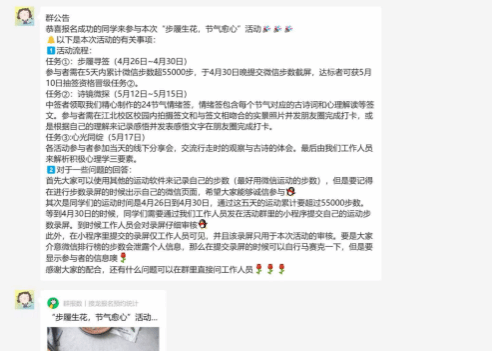 本次“步履生花,节气愈心”活动任务一共收集了21条接龙打卡记录,微信步数接龙打卡人员来自嘉应学院化学与环境学院、计算机学院、教育科学学院等6个二级学院,任务一后由项目工作人员审核出获得抽签机会的21人进入任务二。各位参与者积极参与活动,通过运动锻炼来积累步数进行打卡。此次活动不仅丰富了同学们的课余生活,激发了大家的运动热情,还促进了不同学院同学之间的交流与互动,营造了积极向上、健康活力的校园氛围,让运动成为一种习惯,让健康融入生活,推进了嘉应学院校园文化建设。