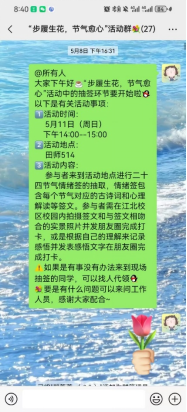 编辑活动通知发至各年级心委群和制作有关推文发送至嘉应心协公众号进行宣传。